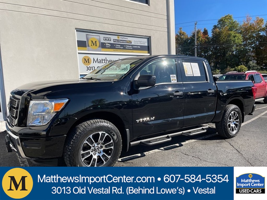 Matthews Import Center promises each customer a thorough and confident 120-point inspection on our used inventory guaranteeing a relaxing and peace-of-mind experience. We are located behind Lowes in Vestal NY. Or call us at (607) 729 - 6261Matthews Import Center3013 Old Vestal RoadVestal NY 13850. Super Black 2024 Nissan SV Titan 4WD 9-Speed Automatic 5.6L V8 DOHC 32V LEV3-ULEV70 400hp