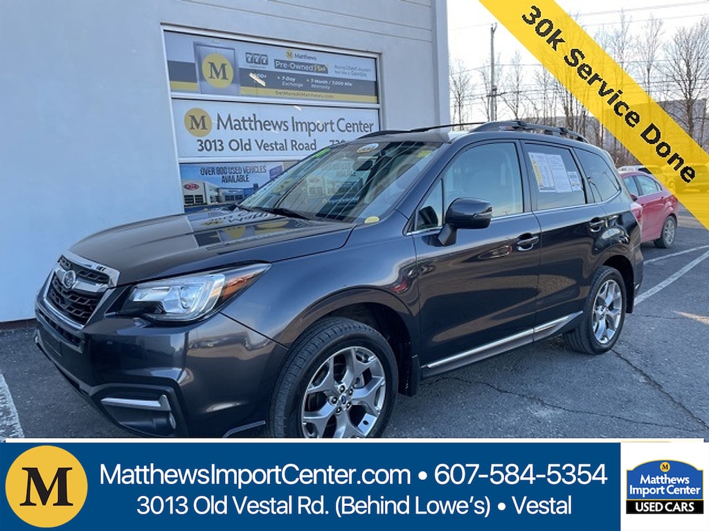 Matthews Import Center promises each customer a thorough and confident 120-point inspection on our used inventory guaranteeing a relaxing and peace-of-mind experience. We are located behind Lowes in Vestal NY. Or call us at (607) 729 - 6261Matthews Import Center3013 Old Vestal RoadVestal NY 13850. Dark Gray Metallic 2018 Subaru 2.5i Touring Forester AWD Lineartronic CVT 2.5L 4-Cylinder DOHC 16V VVTOdometer is 56990 miles below market average! 26/32 City/Highway MPGAwards: * 2018 KBB.com 10 Best All-Wheel-Drive Vehicles Under $25000 * 2018 KBB.com 10 Best SUVs Under $25000 * 2018 KBB.com 10 Most Awarded Brands * 2018 KBB.com Brand Image Awards